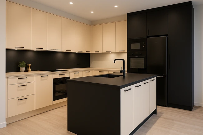 - Integrează electrocasnicele: mobilierul pe comandă îți permite organizare eficientă și personalizată.
